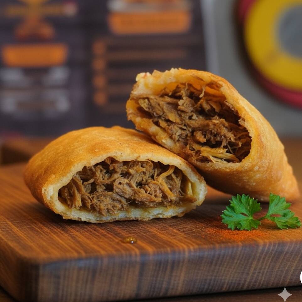 Empanada grande de masa semidulce, rellena con carne desmechada jugosa, acompañada de salsa a eleccion