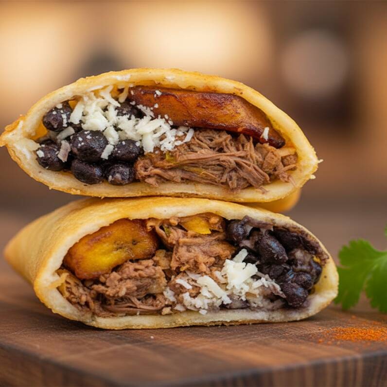 Empanada grande de masa semidulce, rellena de carne desmechada, caraotas (frijol negro), tajada de platano maduro y queso blanco, acompañada de salsa a eleccion