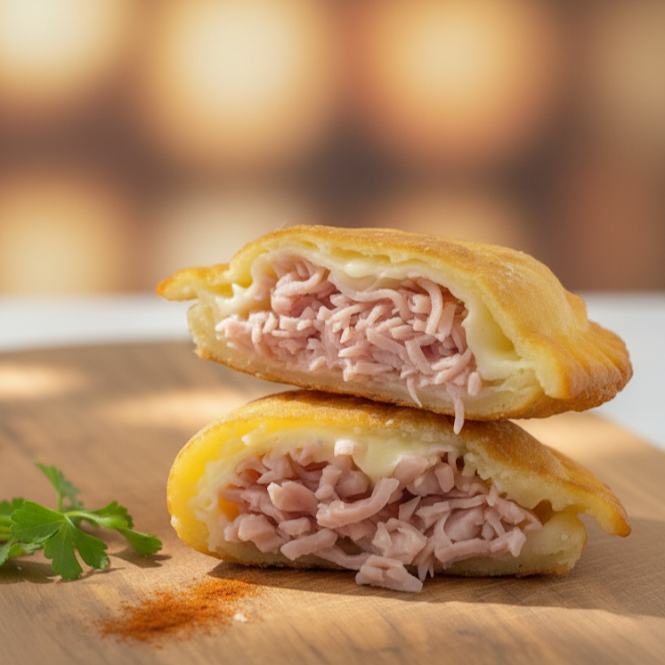 Empanada grande de masa semidulce, rellena de jamon y queso blanco, acompañada de salsa a eleccion