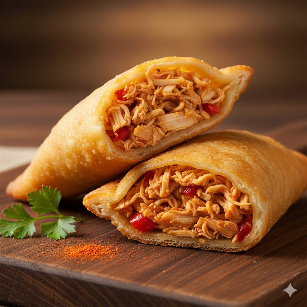 Empanada grande de masa semidulce, rellena de jugoso pollo desmechado, acompañado con salsa a eleccion