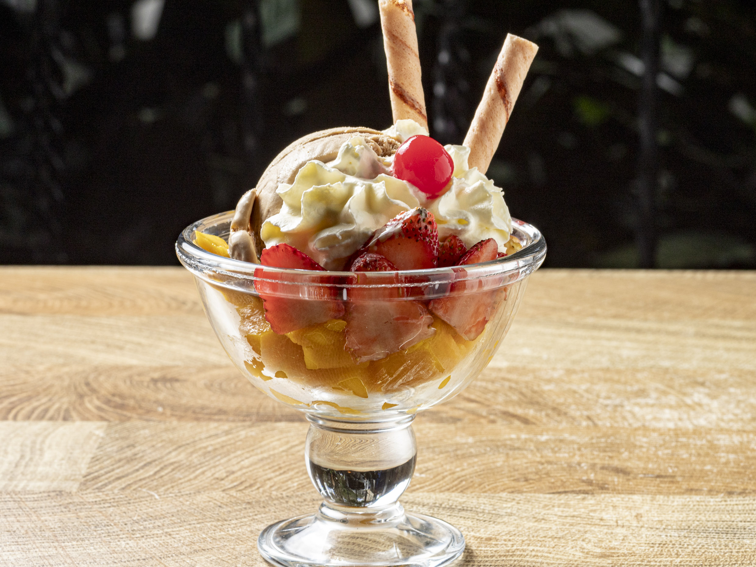 Frutas variadas (banano, piña, fresa, papaya), crema de leche o yogurt, porción de queso, dos helados a elección, crema chantilly.