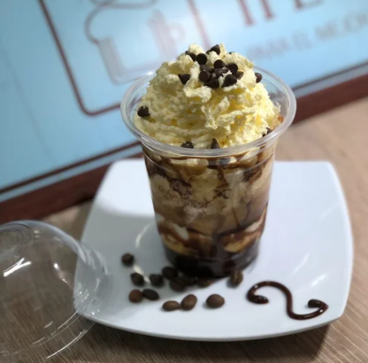 Helado de vainilla, con salsa Hershey´s, café, crema chantilly y lluvia de chocolate.