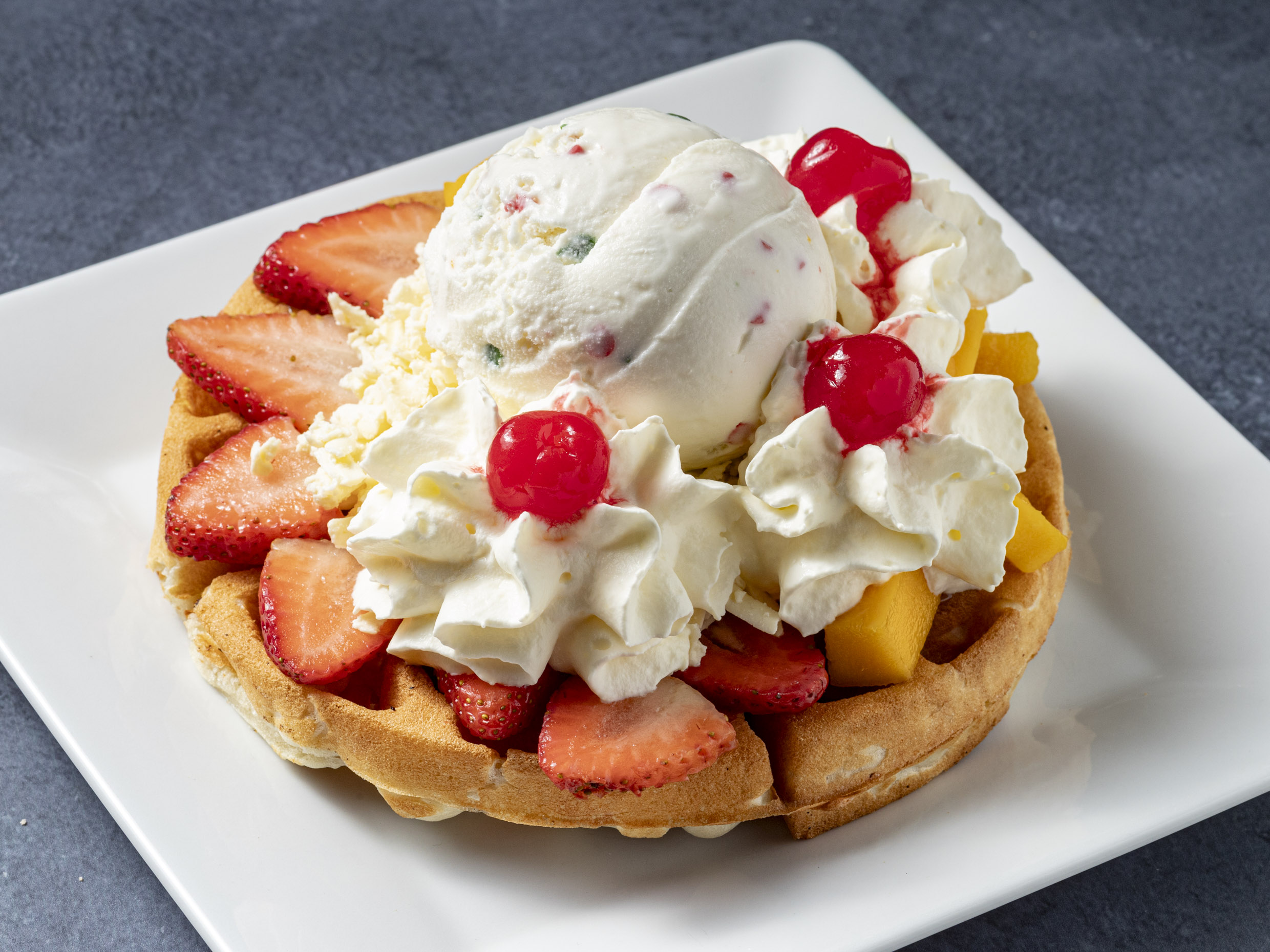 Waffle con dos porciones de fruta a elección, queso, una porción de helado a elección, crema chantilly y cerezas.
