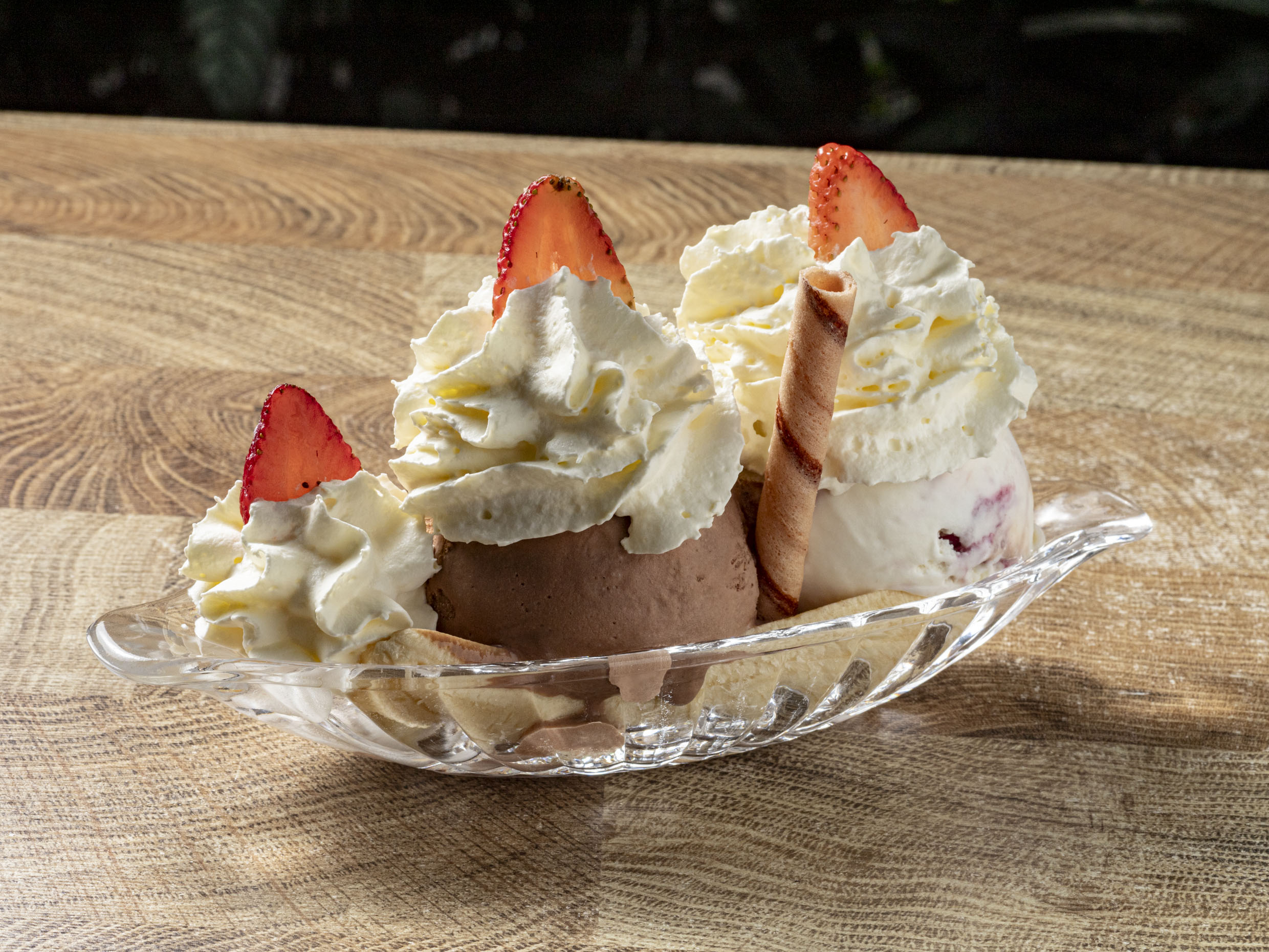 Porción de banano partido, 2 bolas de helado del sabor que desees, crema chantilli y fresas encima