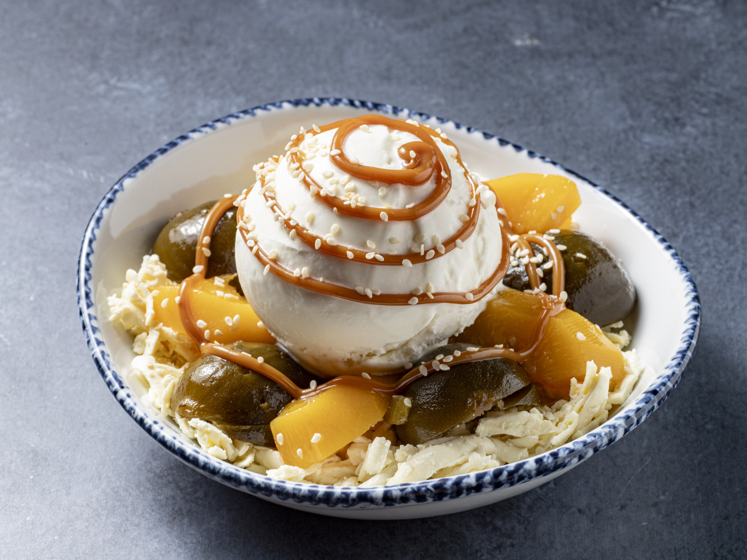 Porción de duraznos y brevas, con queso blanco rallado, una porción de helado a elección, adornado con salsa dulce de arequipe y semillas de ajonjolí.