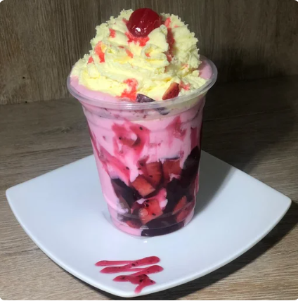 Malteada con helado de frutos rojos, con trozos de fresa, cereza, salsa de mora y crema chantilly.