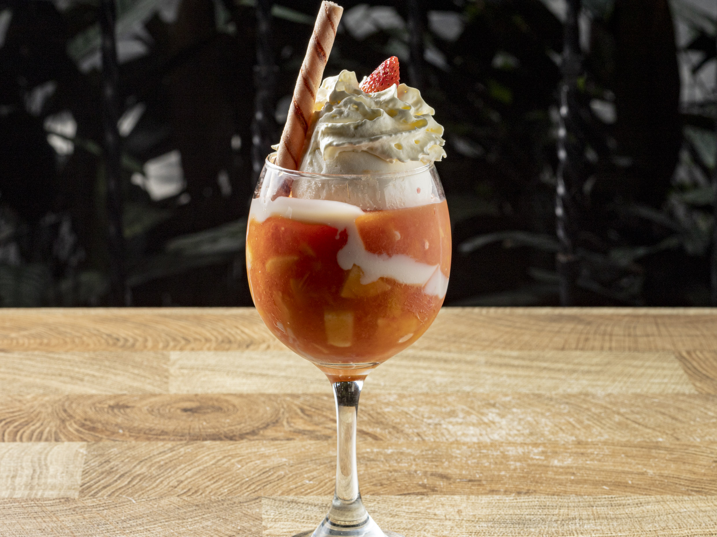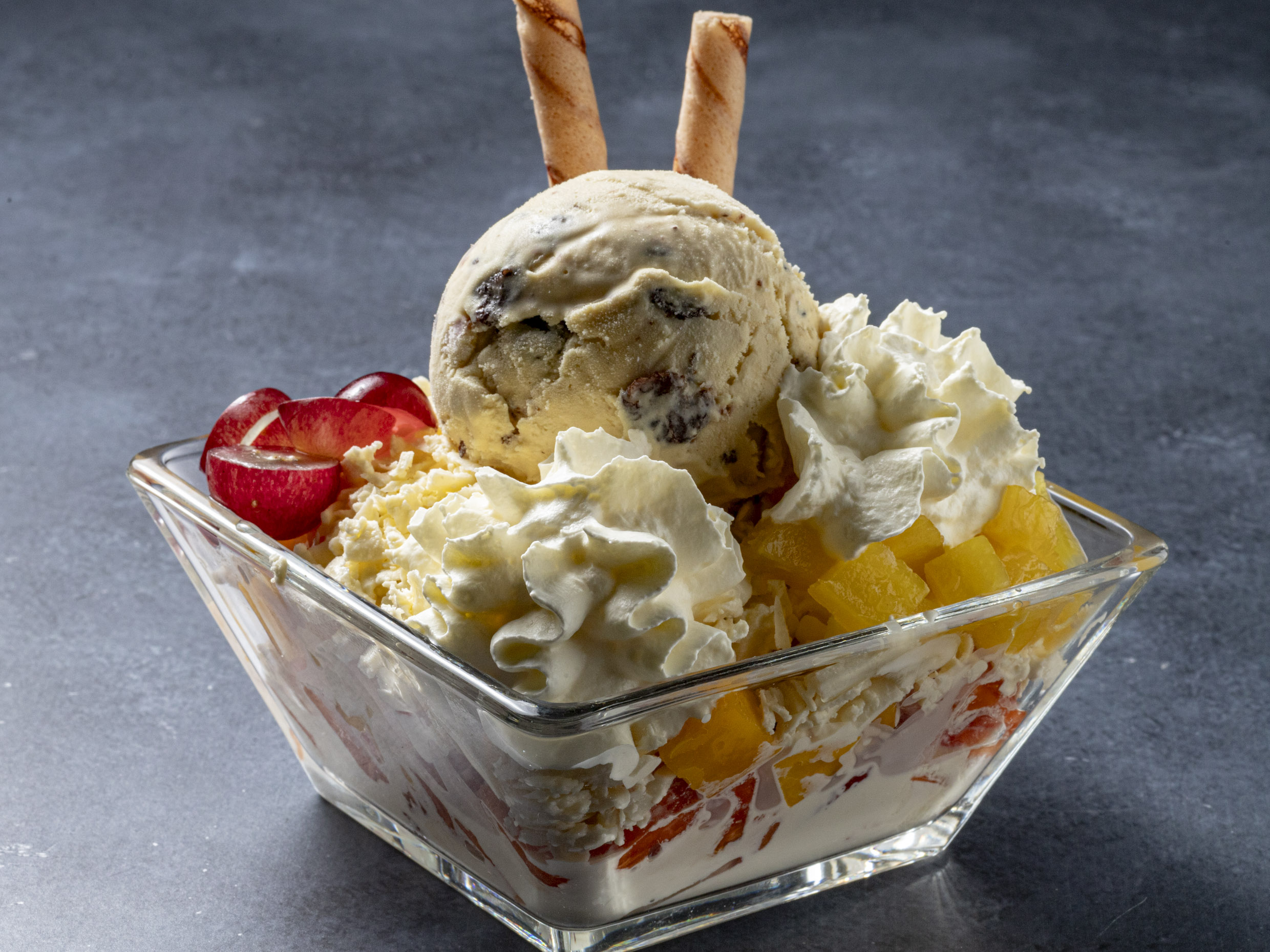 Dos porciones de fruta a elección, una porción de helado a elección, crema chantilly y cereza.