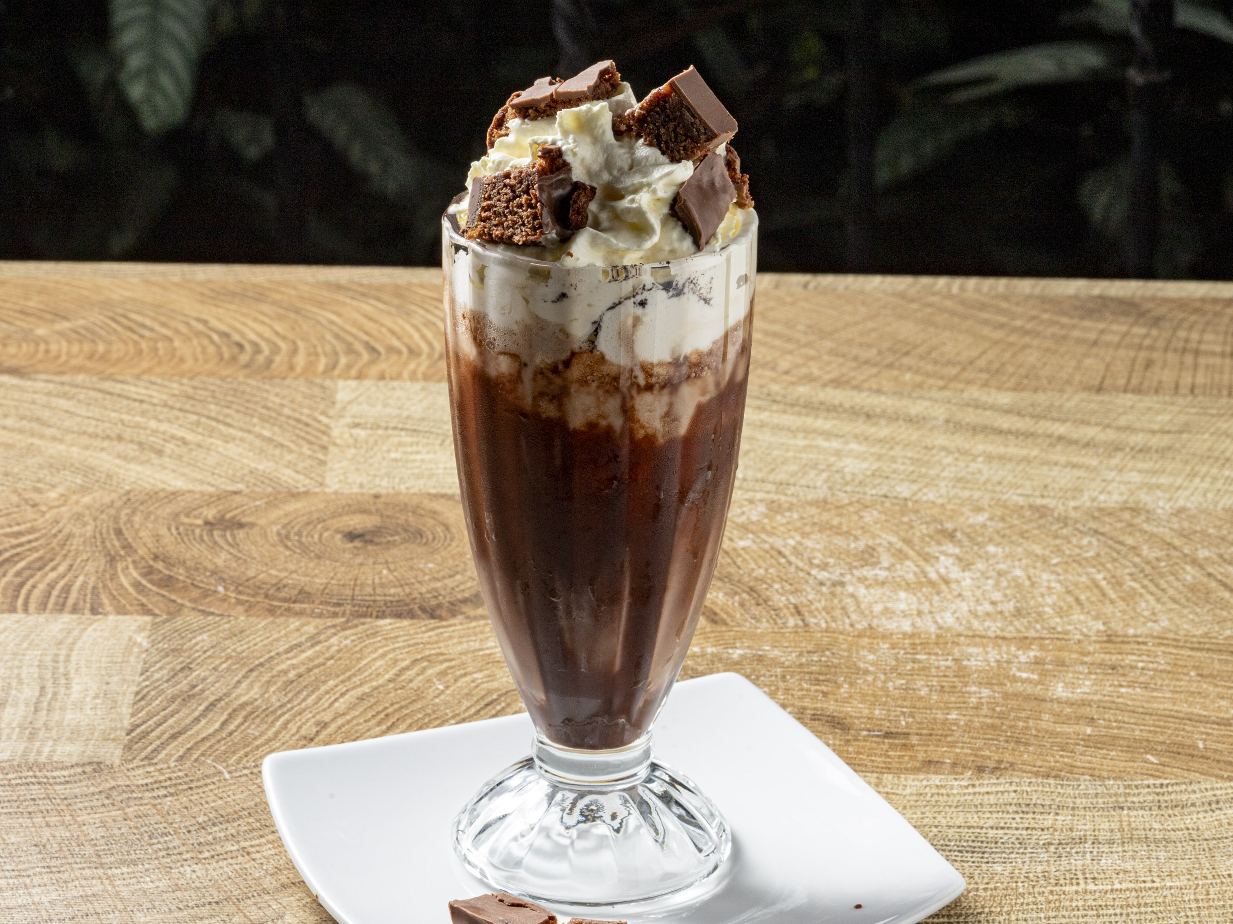 Malteada de brownie con trozos de torta de brownie, salsa de chocolate y crema chantilly.