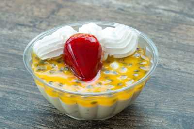 Postre a base de tres leches con sabor a maracuyá y cobertura de maracuyá, crema y una fresa.