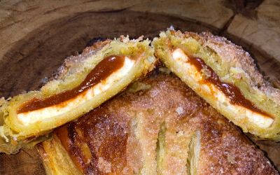 Delicioso hojaldre relleno de arequipe y queso industrial.