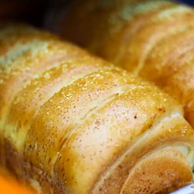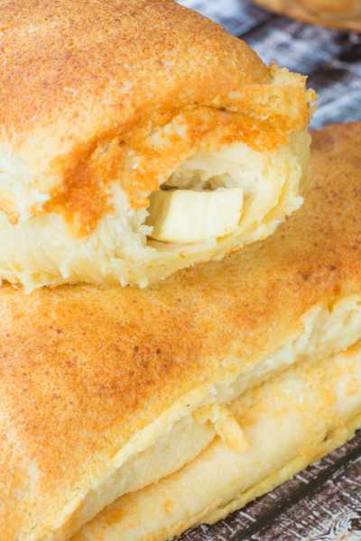 Delicioso pan aliñado relleno de cuajada y cobertura de batido de tres quesos.