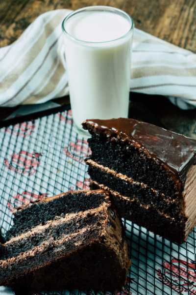 Deliciosa torta remojada en vino con cobertura de chocolate (porción personal).