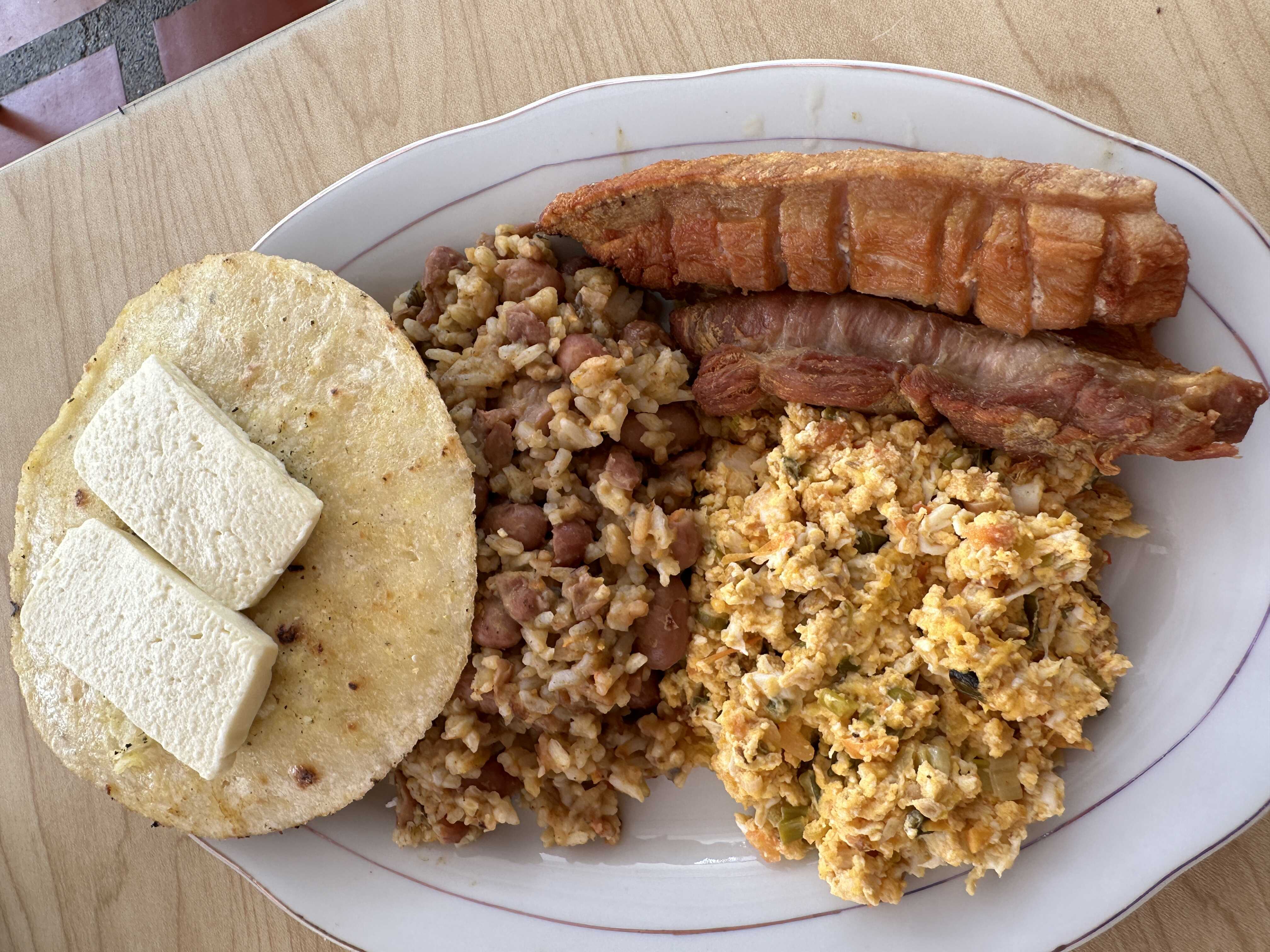 Huevos revueltos con arroz, arepa con cuajada y chocolate