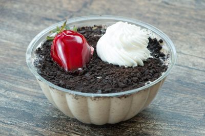 Postre a base de tres leches con adición de oreo y cobertura de oreo triturada, crema y fresa.