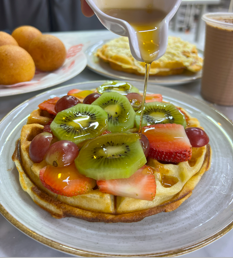 Delicioso waffle de almojabana con frutas (Kiwi, uva, fresas)