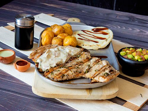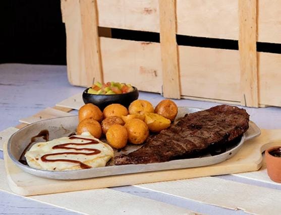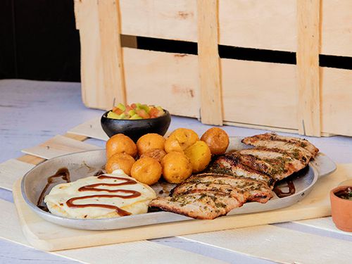 Deliciosa parrillada 400 grm churrasco,lomo cerdo,pechuga acompañado de papitas,arepa con queso,guacamole incluye gaseosa 250 lo a disponibilidad de a tienda