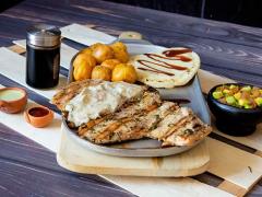 Lomo de cerdo al grill 5 sabores a elección, acompañada de papitas, arepa cannibal con queso, Incluye gaseosa flex 200 ml.