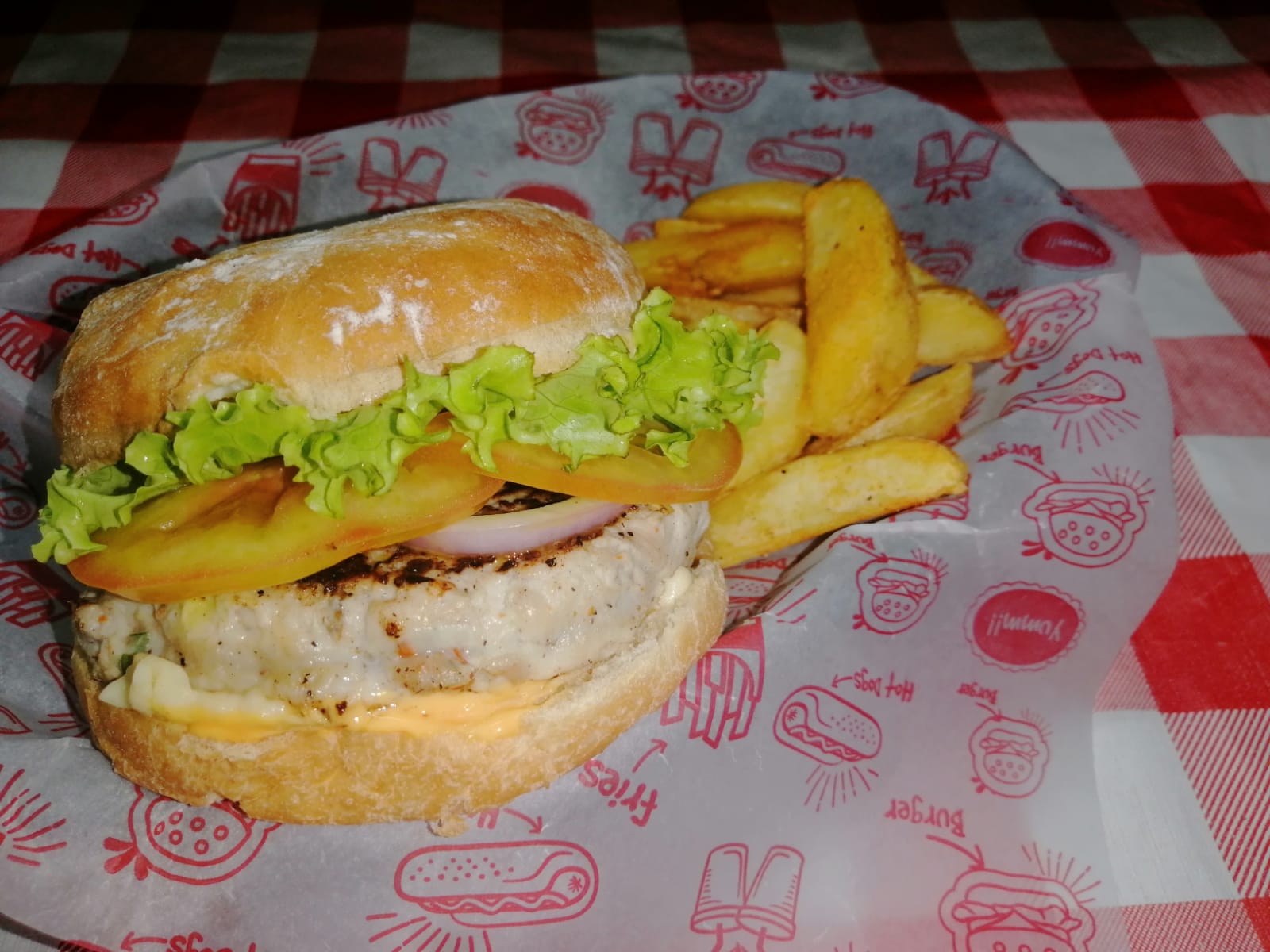 Hamburguesa con pan artesanal,150 grm carne 100% res a la parrilla, lechuga, tomate, pepinillos, queso mozzarella,salsa queso cheddar, jalapeños y cebolla. acompañada de papitas