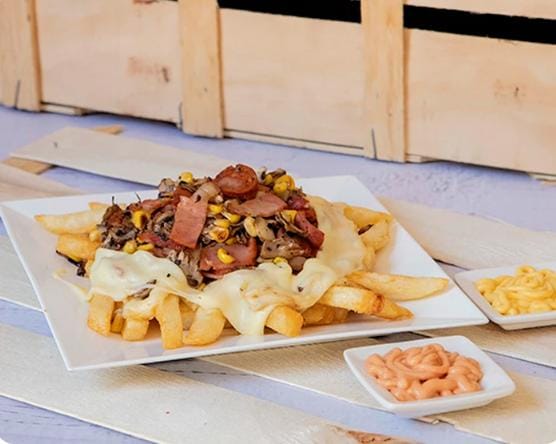 250 grm papa francesa , tocineta, maíz, salchicha, chorizo , gaseosa 250 a disponibilidad de la tienda