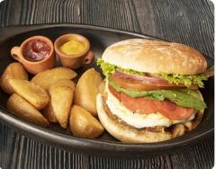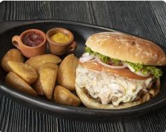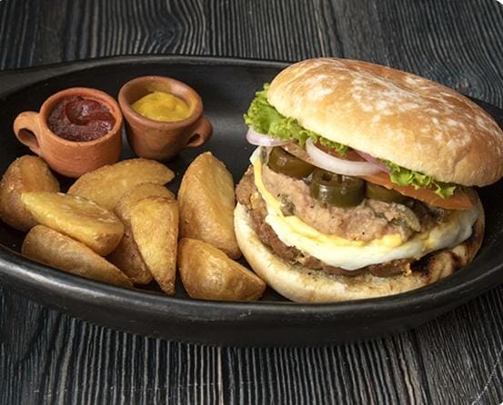 Hamburguesa con pan artesanal, 150 gr carne 100% res a la parrilla, lechuga, tomate, pepinillos, queso mozzarella, champiñones en bechamel en salsa de la casa, acompañada de papitas a la francesa