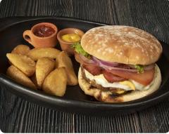 Hamburguesa con pan artesanal, 150 grs de carne 100% res a la parrilla, lechuga, tomate, queso mozzarella, salsa cheddar y bacon tocineta en salsa de la casa. Acompañada de papas