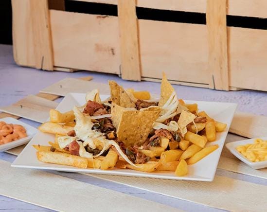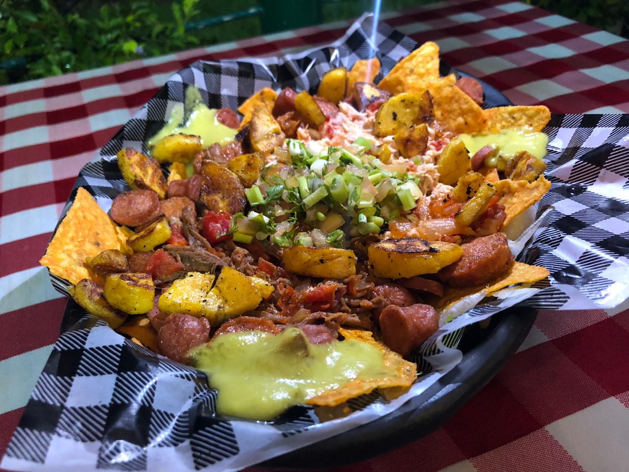 Doritos, acompañados de salchicha Ranchera,chorizo,maiz maduritos y un súper mega pico de gallo.
