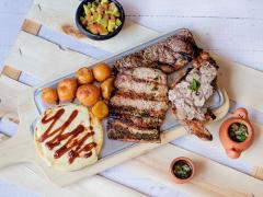 Deliciosa parrillada 450 grm, res, lomo de cerdo y pechuga, acompañada de papitas, arepa cannibal con queso, guacamole