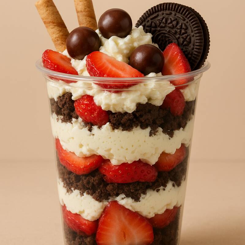 Fresas con chantilly, brawnie acerezado y galleta oreo coronado con esferas de chocolate y barquillos piazza ¡Una combinación irresistible!
