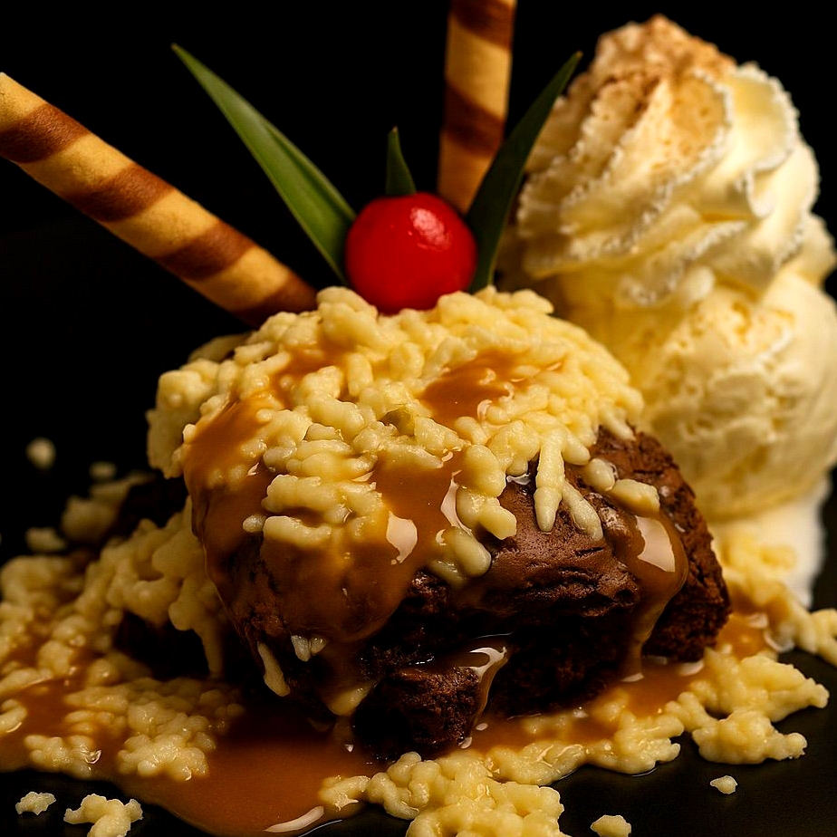 Brownie acompañado de una porción de queso, tu helado favorito, Chantilly, barquillos crocantes y una cereza en la cima. ¡Una combinación única y deliciosa!