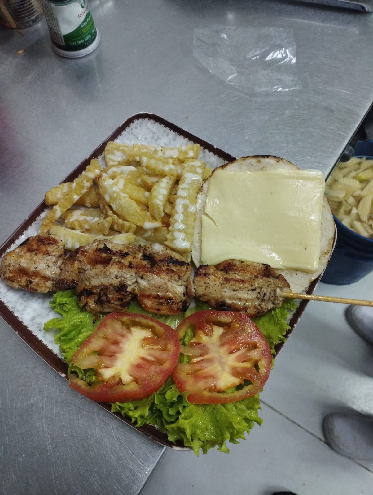 Chuzo de pollo asado al carbon, acompañado de arepa asada con queso mozarella y papas a la francesas con salsas a eleccion.