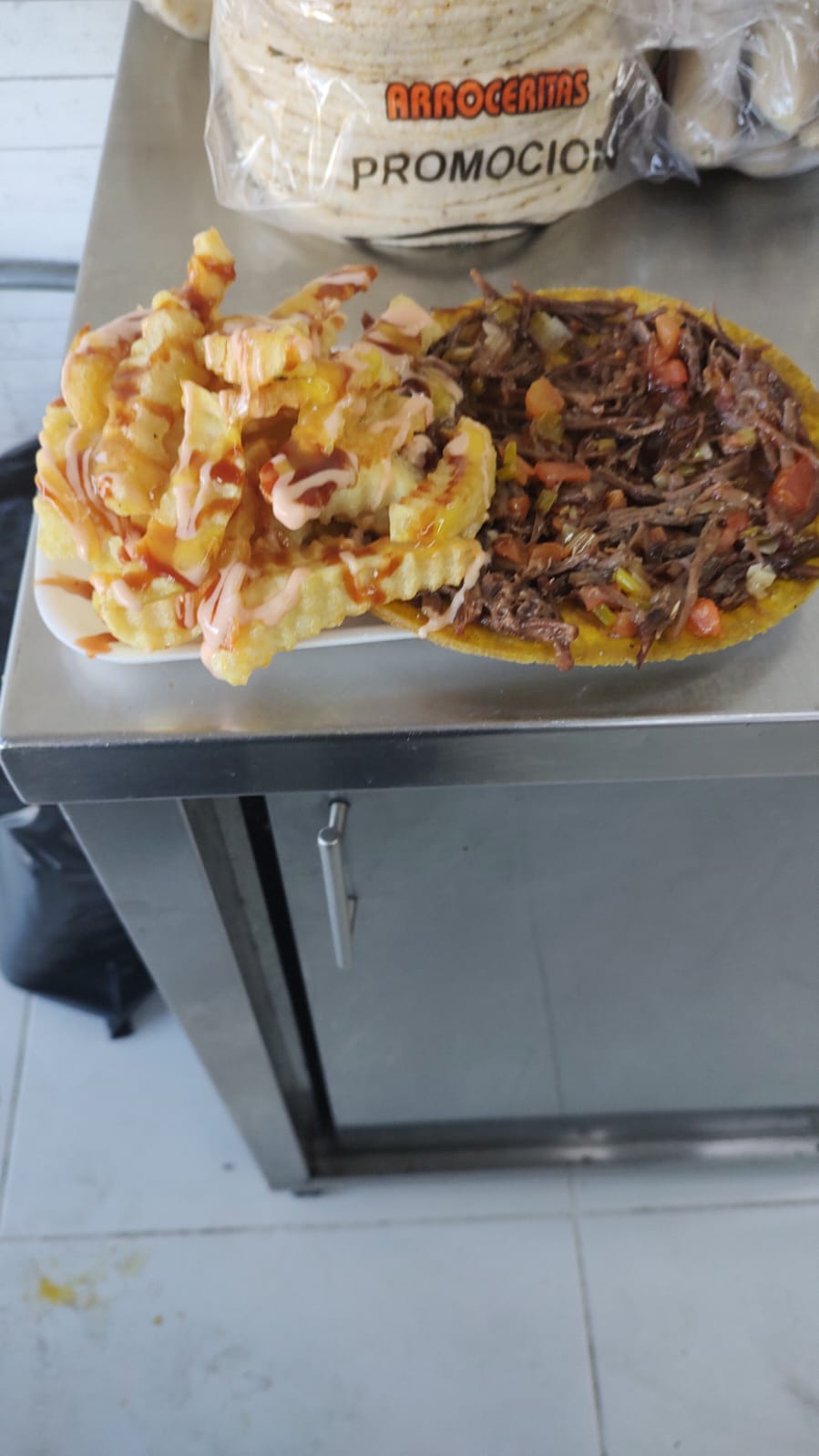 Patacón especial con carne de res desmechada, acompañada de papas francesas con salsas.