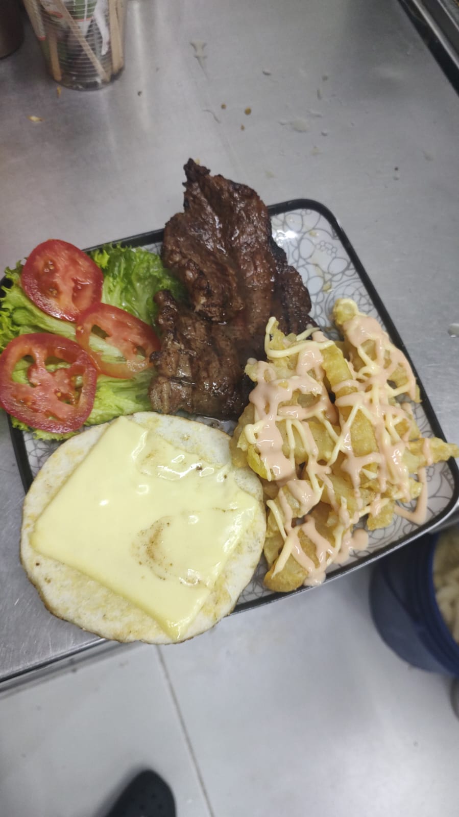Deliciosa arepa de carne de res, acompañada con papas a la francesas y salsas