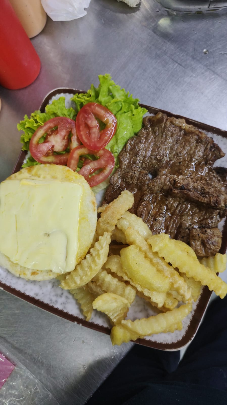 Carne chata de 250gr, papas a la francesa, una arepa asada con queso mozzarella