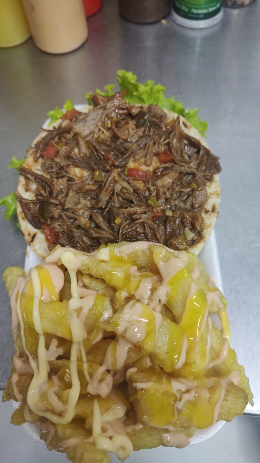 Deliciosa arepa mixta especial con pollo desmechado, carne desmechada, acompañada con papas a la francesas y salsas