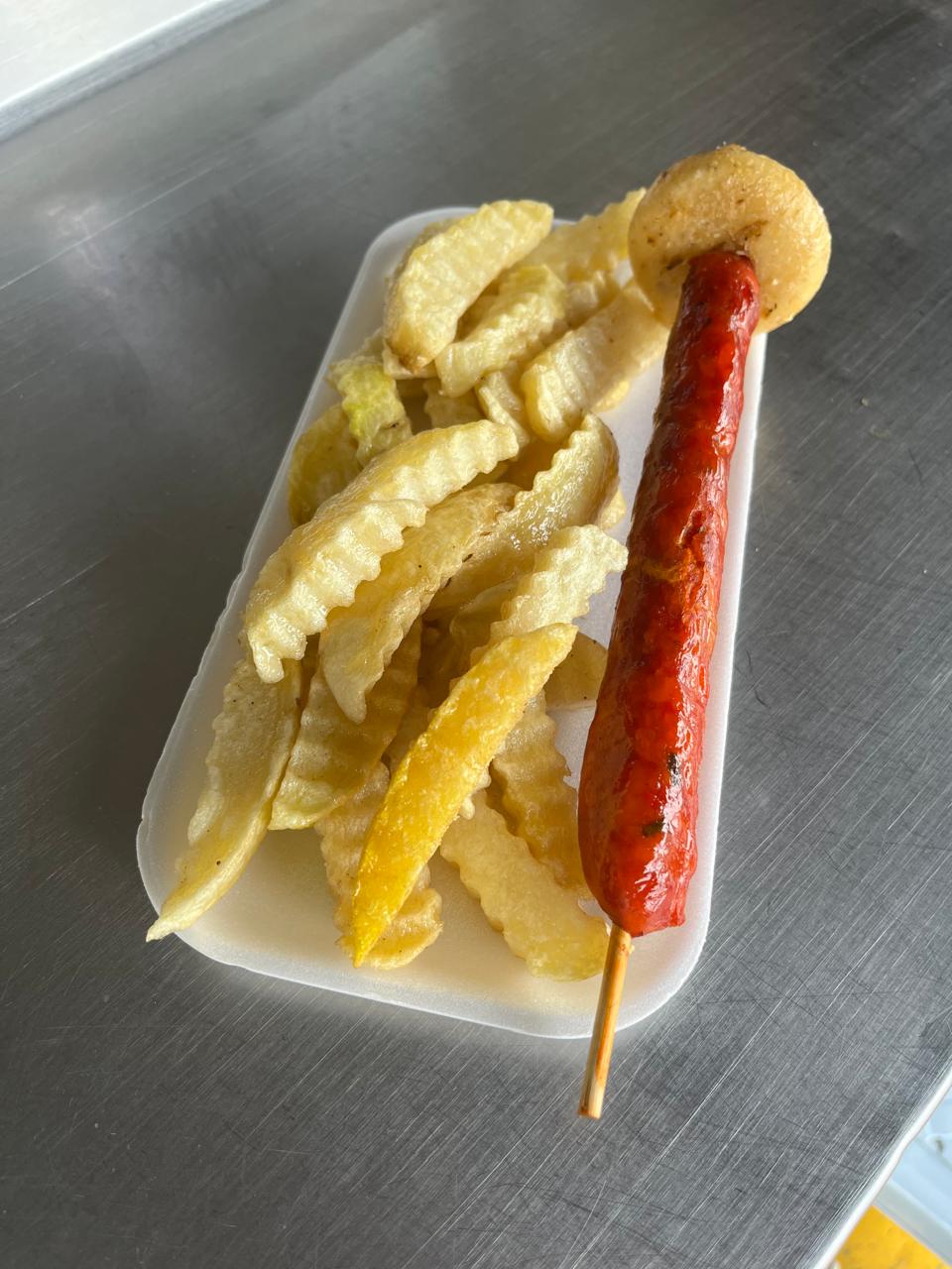Chuzo de carne de cerdo asada al carbon, acompañado de arepa asada con queso mozarella y papas a la francesas con salsas a eleccion.