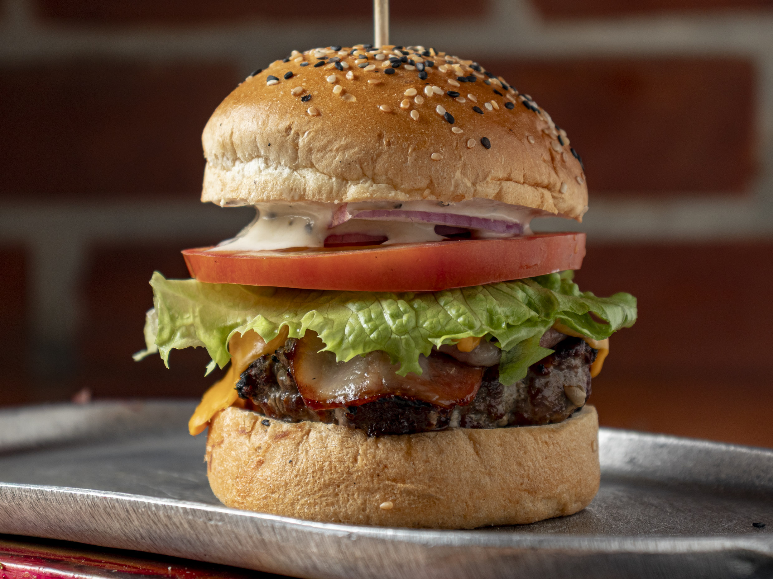 Pan rico en fibra, Carne de res de 130 grs., tocino barriguero ahumado, queso Cheddar, ensalada Coleslaw y nuestra BBQ de la casa