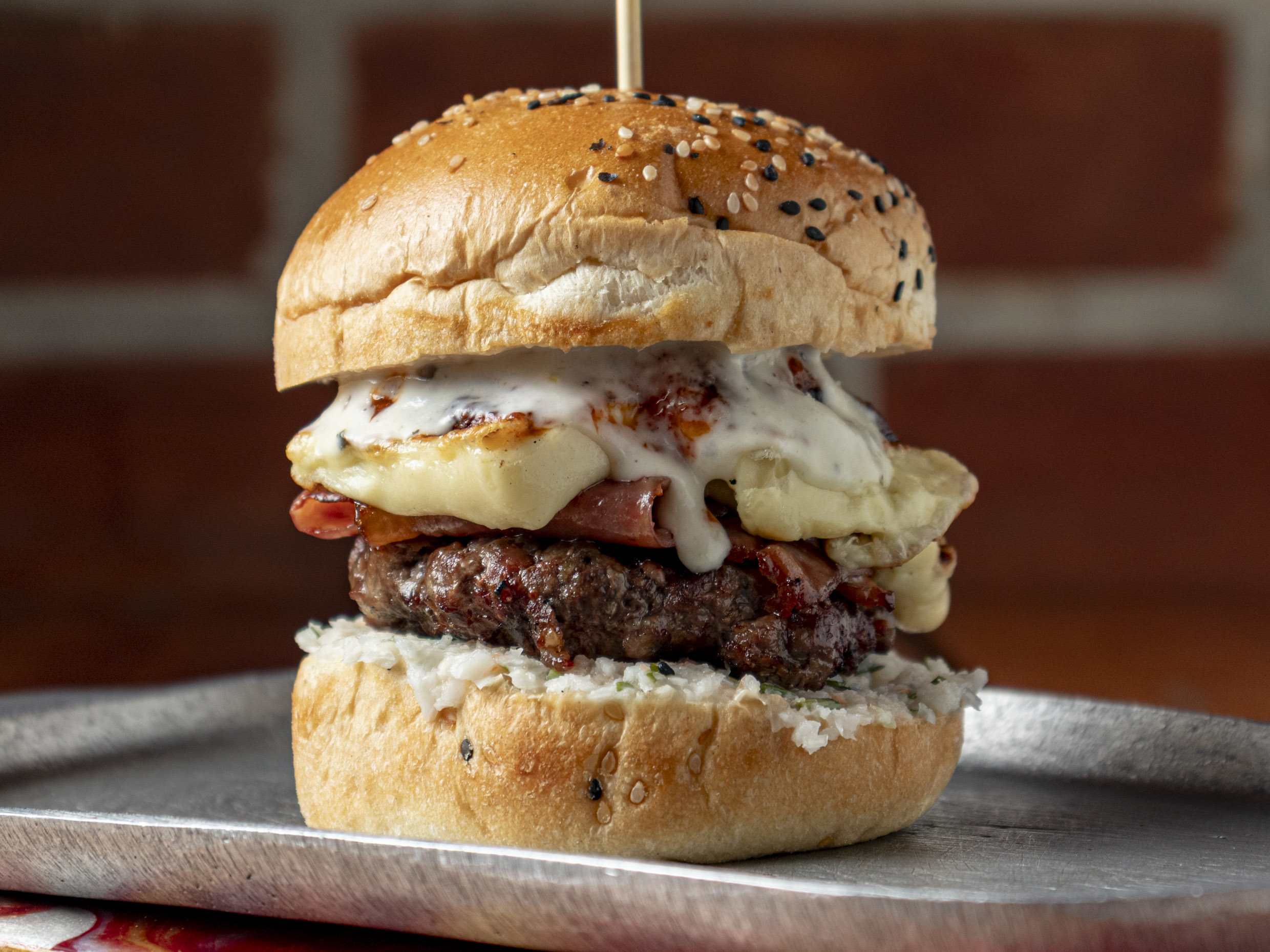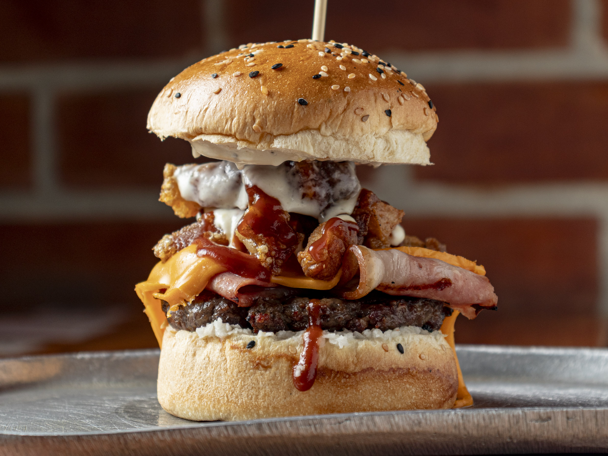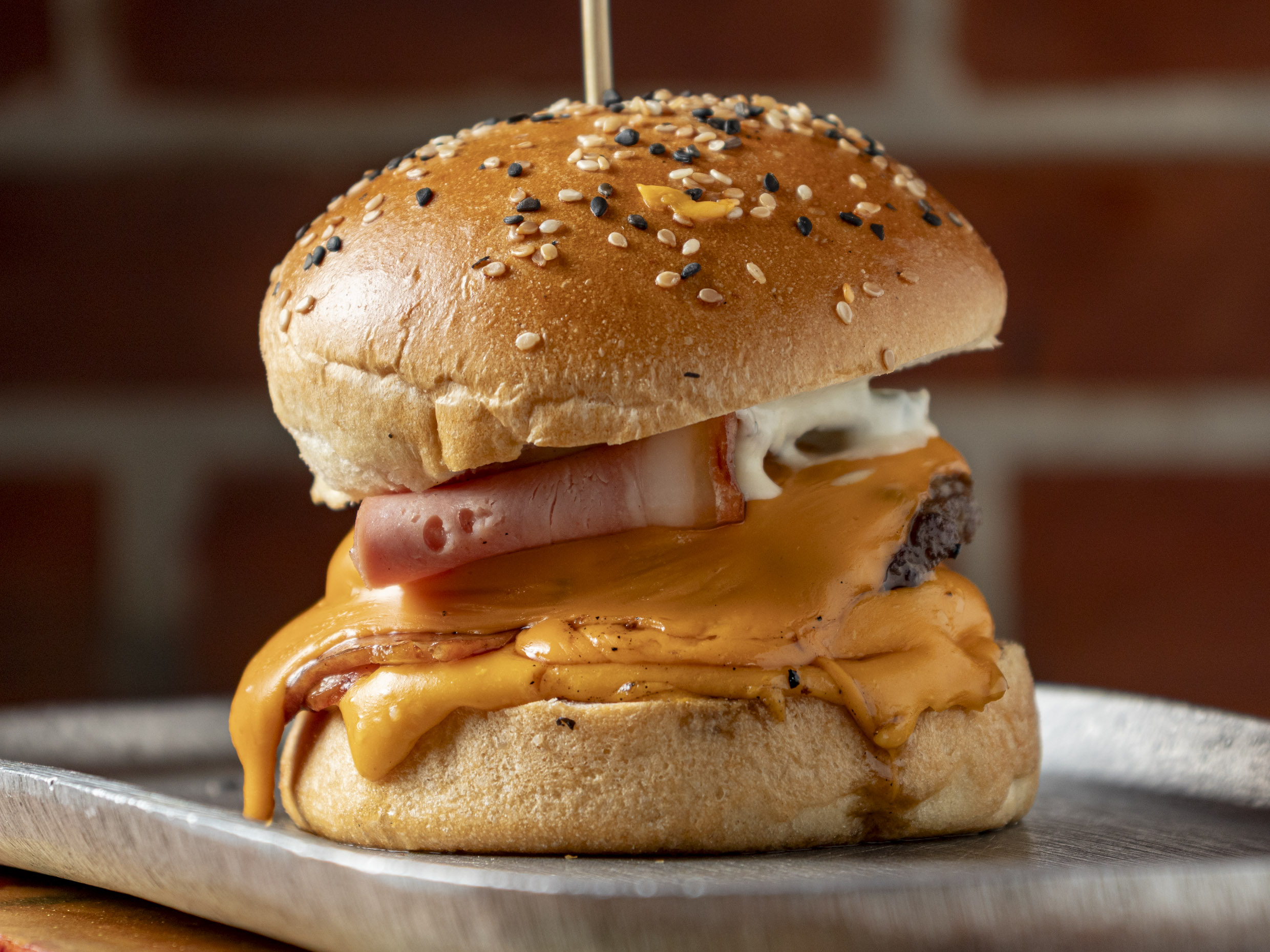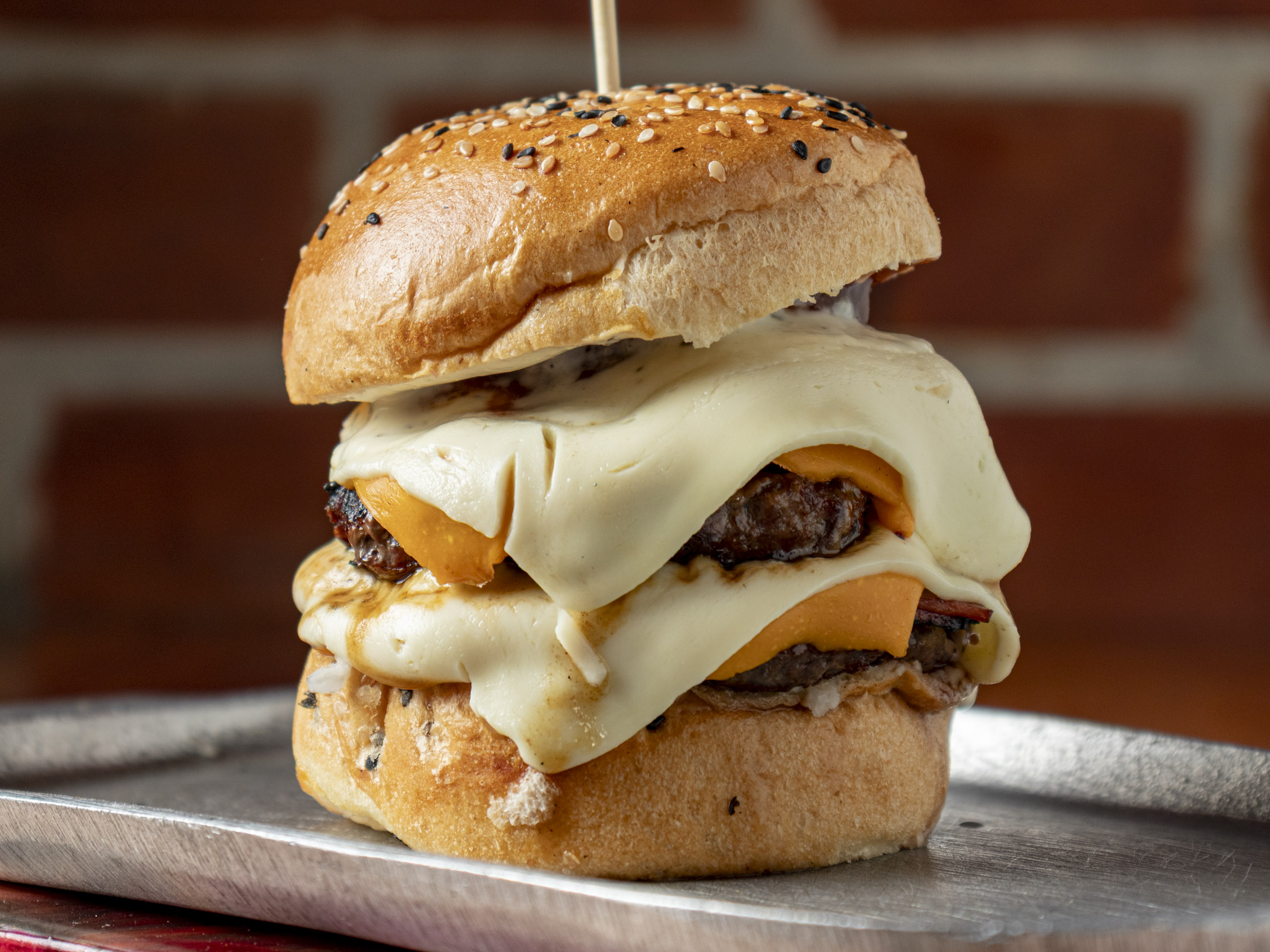 Pan rico en fibra, doble Carne de res cada una de 120 grs., tocineta ahumada, doble queso Mozzarella, doble queso Cheddar y un toque vaquero con su ensalada Coleslaw y pepinillos