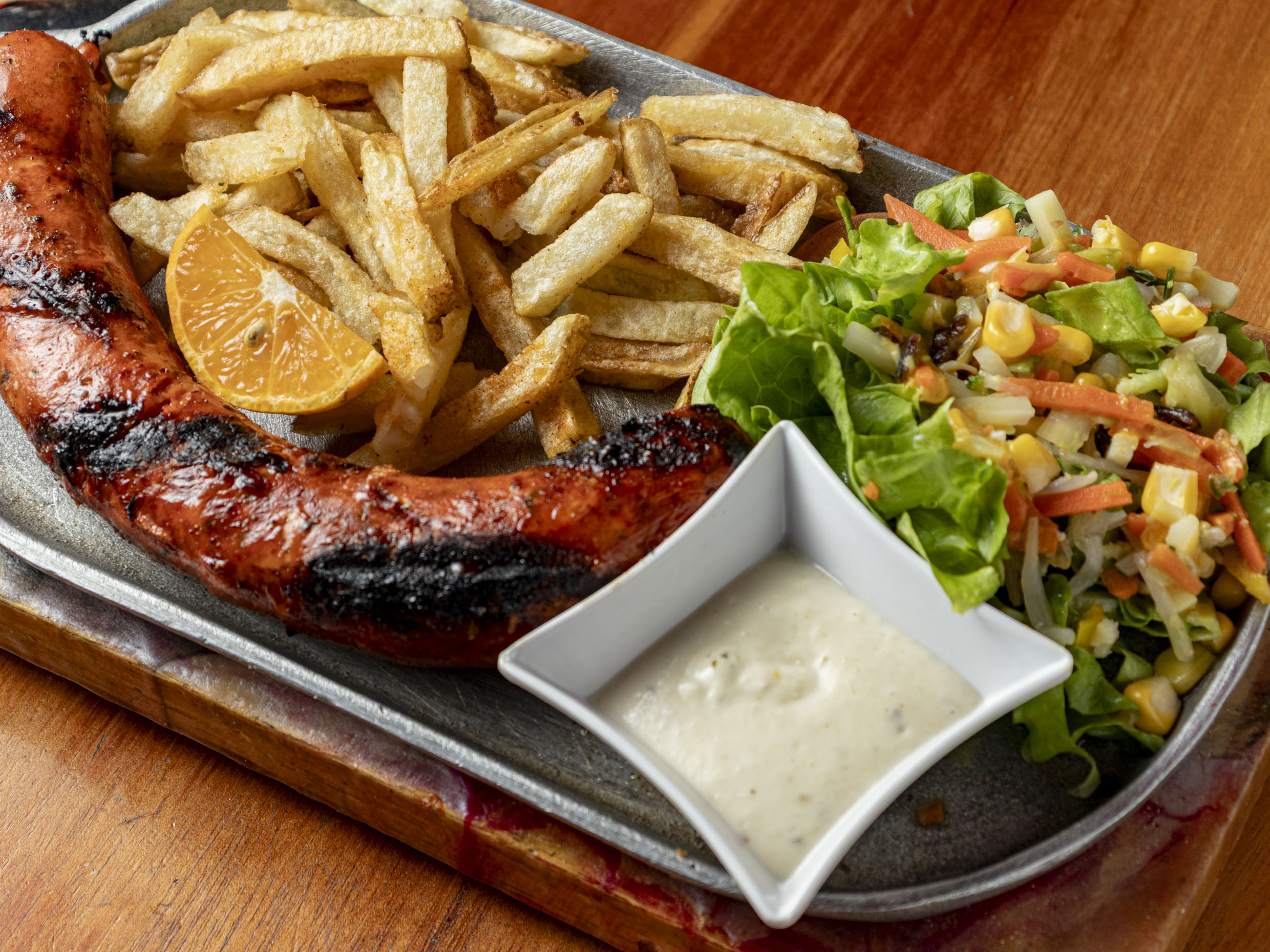 Chorizo llanero de 200gr, acompañado de papas rusticas y ensalada