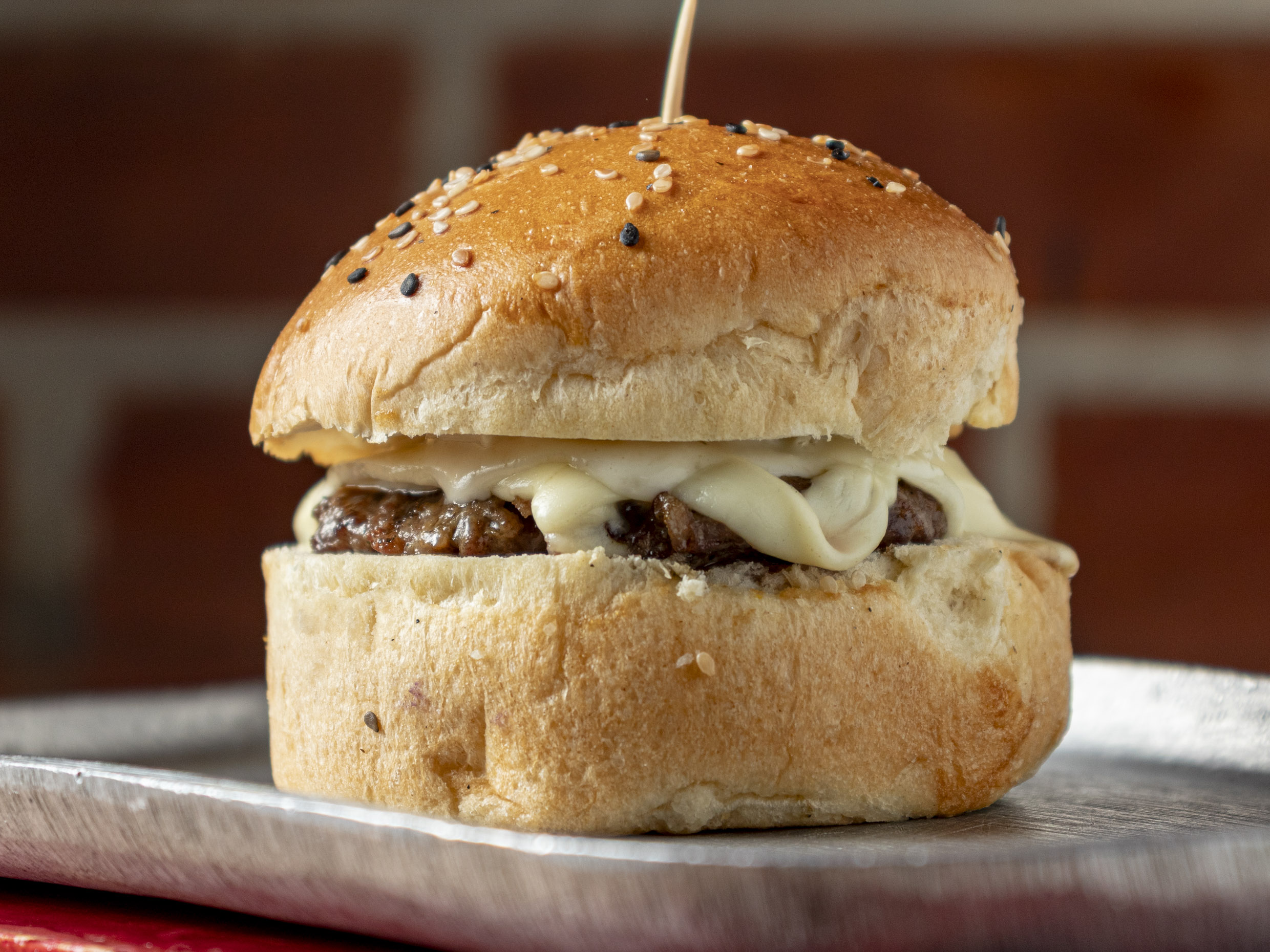 Pan rico en fibra, carne de res de 65 grs., queso mozarella, salsas de la casa y pepinillo agridulce.