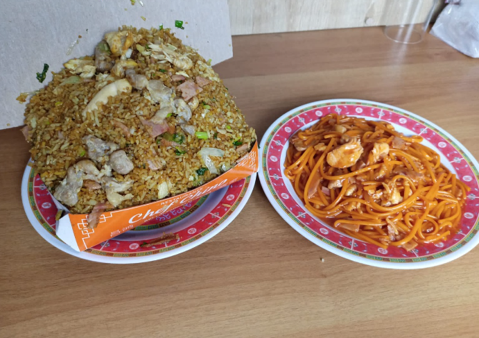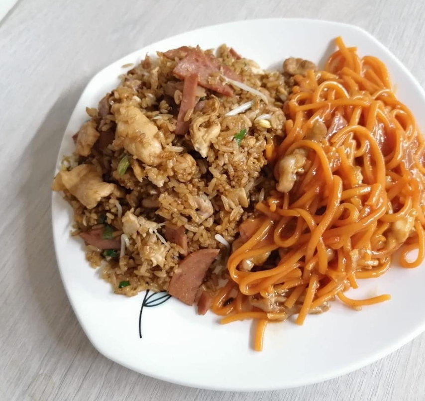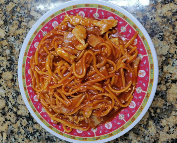 Plato personal de arroz chino especial, acompañado con spaguettis (pollo cerdo y jamon)