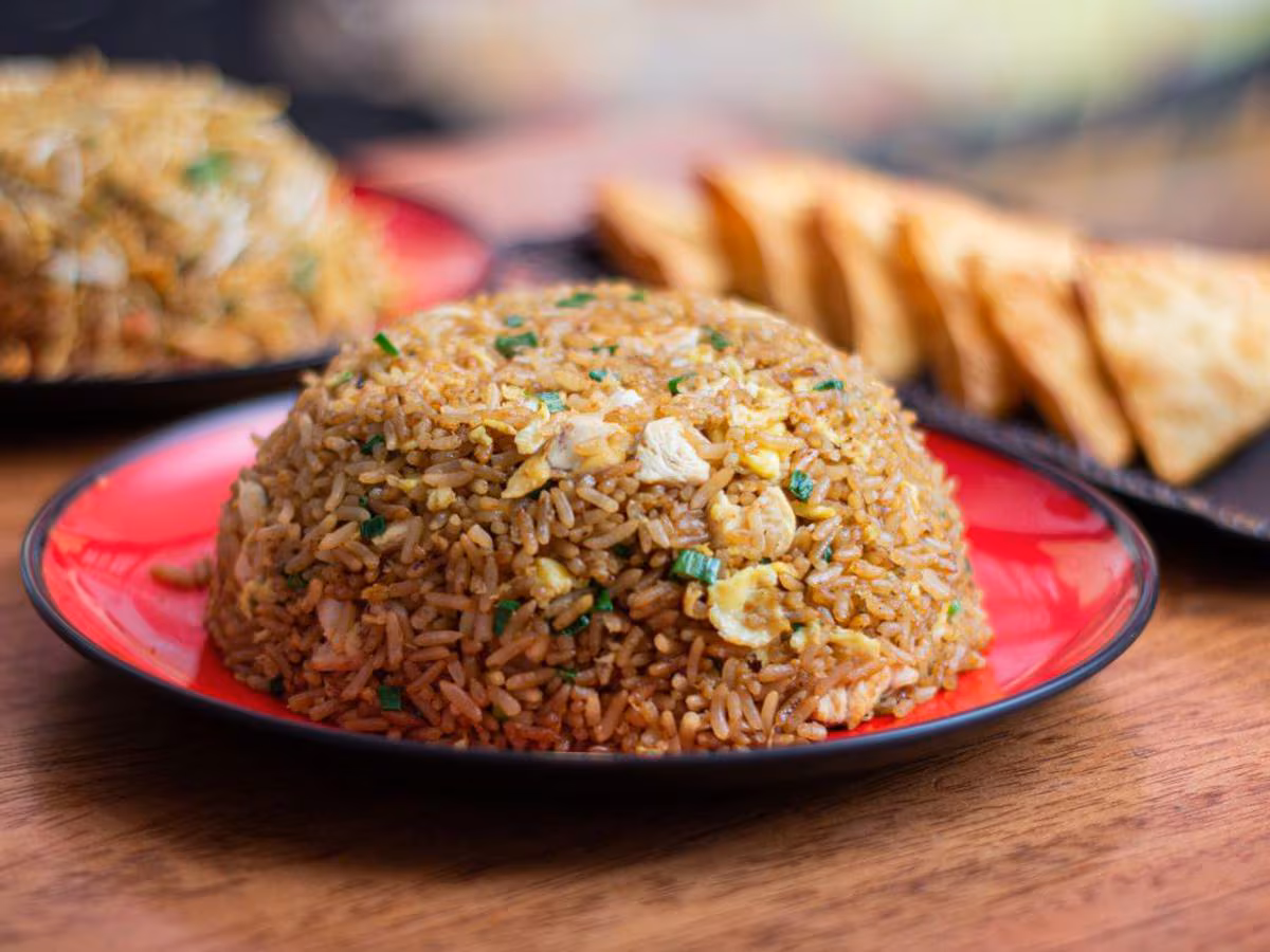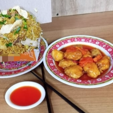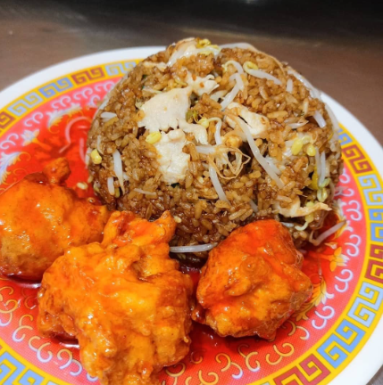 Plato personal de arroz chino especial, acompañado con croquetas de pollo agridulce