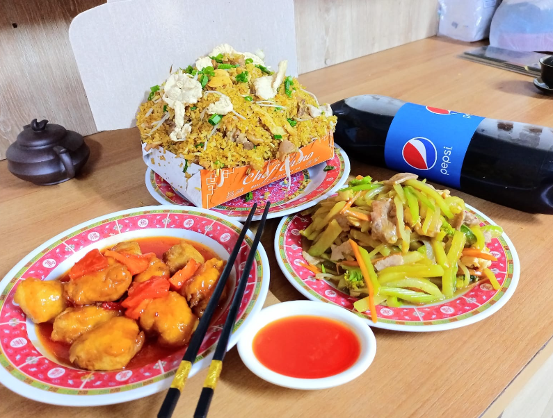 Caja mega de arroz chino especial, acompañada de 8 muslos de pollo apanados y una gaseosa Postobón de 1.5 L.