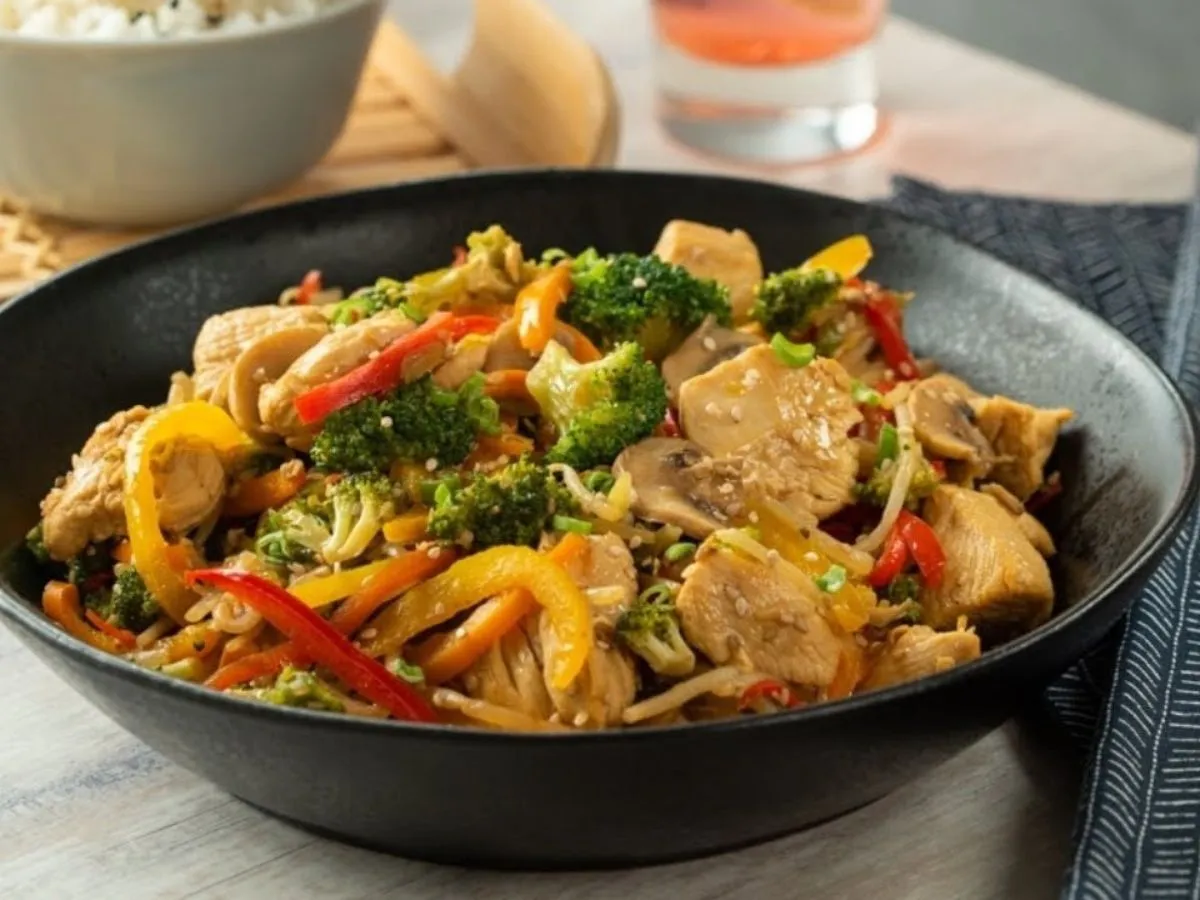 Vegetales salteados en salsa con pollo, perfecto para 2 personas