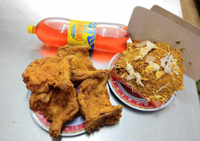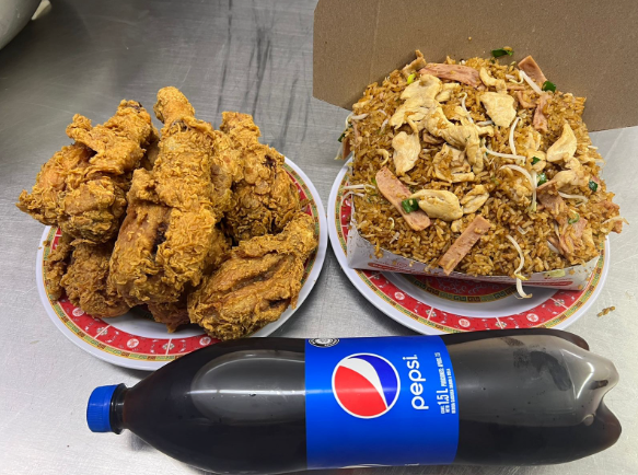 Caja mega de arroz chino especial, con un pollo entero apanado (8 presas de pollo) acompañado con una gaseosa postobon 1.5L