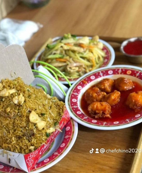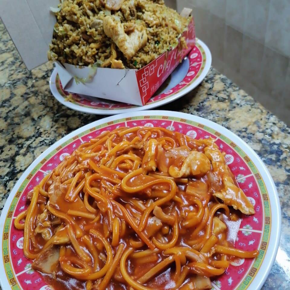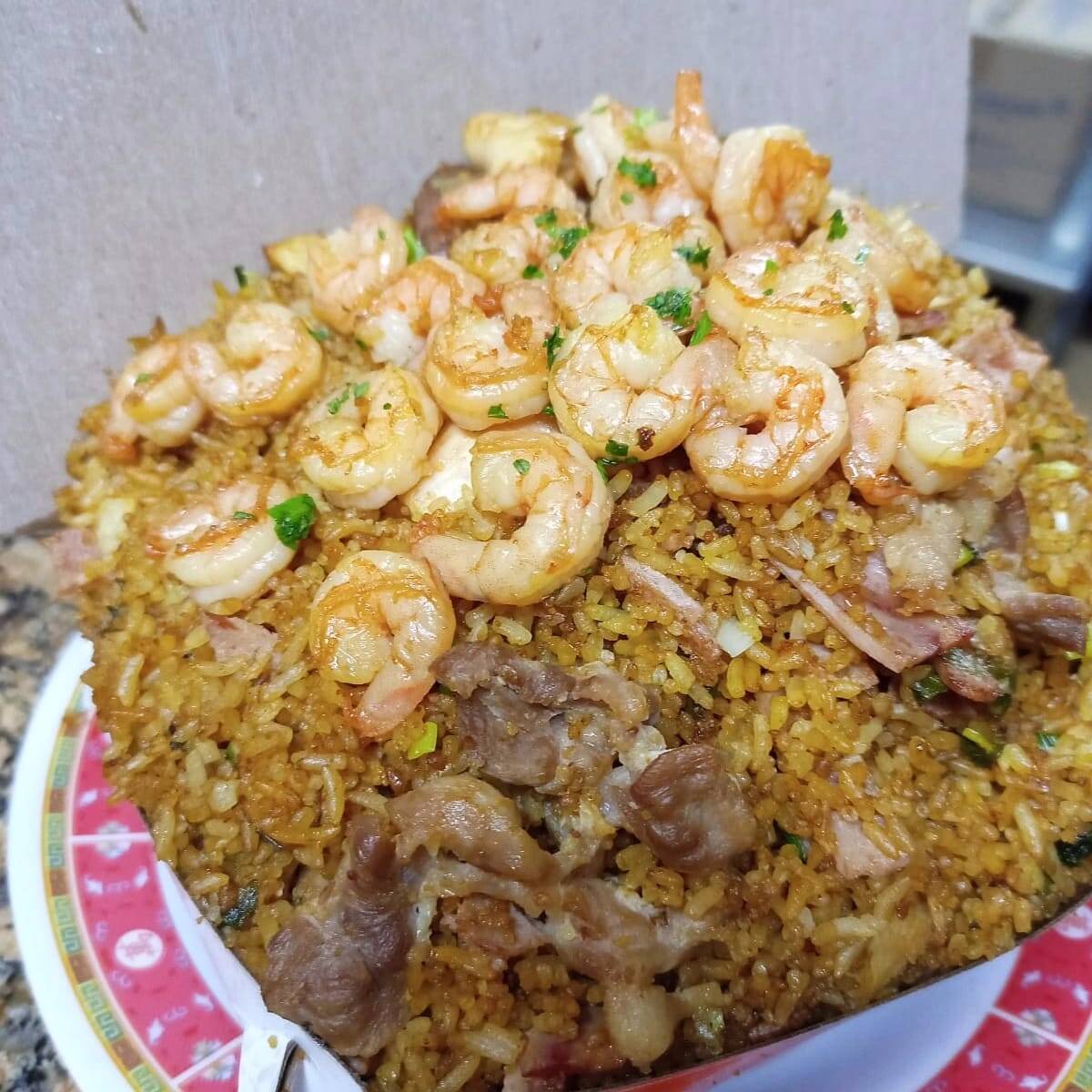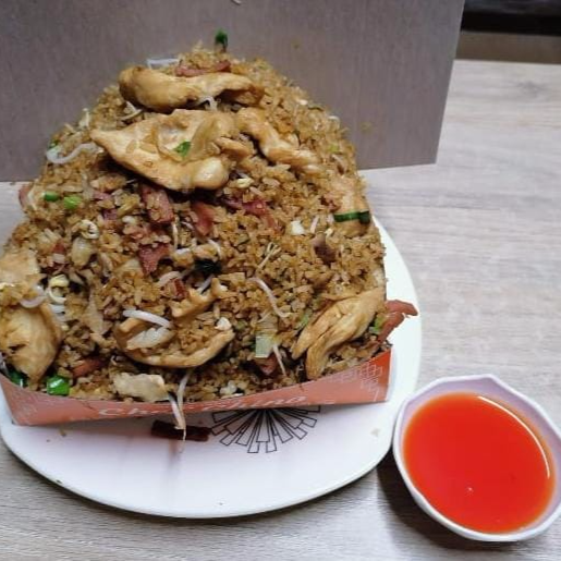 Arroz chino especial mega, con trozos de pollo, cerdo, jamón, raíces chinas y cebolla, acompañado de salsa agridulce. Ideal para 6 o más personas.
