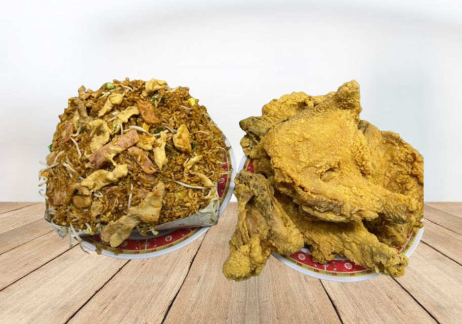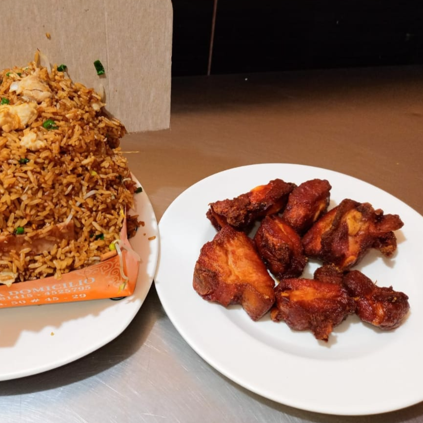 Arroz chino especial mega, acompañado de pollo entero apanado (8 presas de pollo)