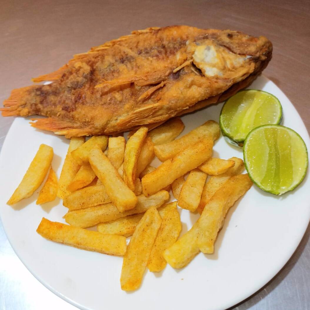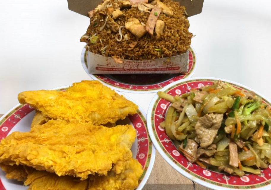 Caja de arroz chino especial grande, acompañado de 4 unidades de filete de robalos apanados, acompañado de chop suey mediano.