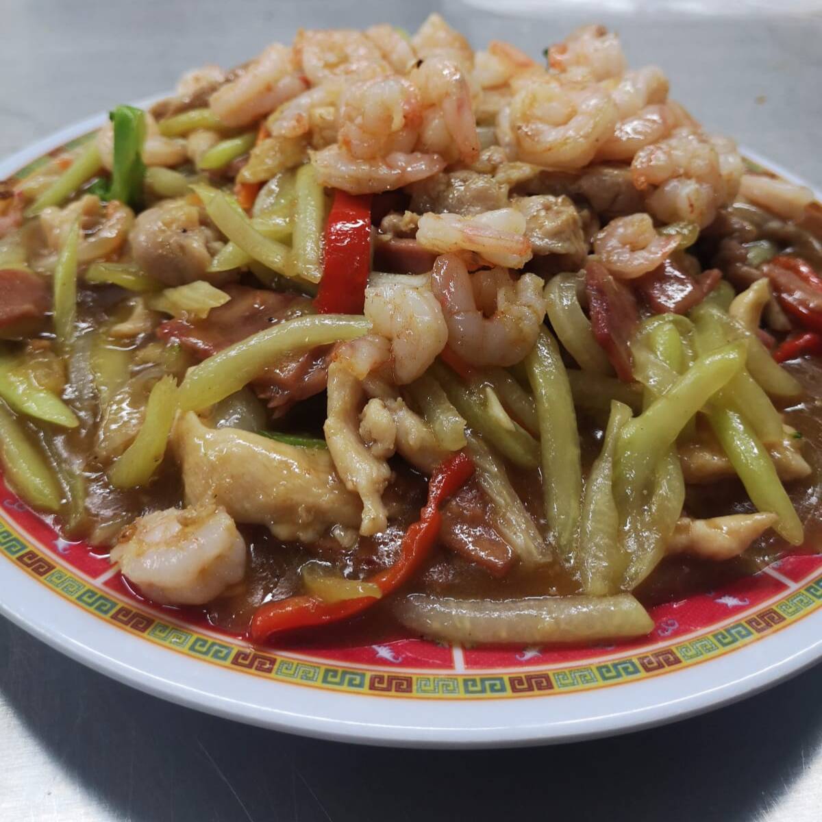 Vegetales salteados en salsa con pollo, cerdo, jamon, camarones.