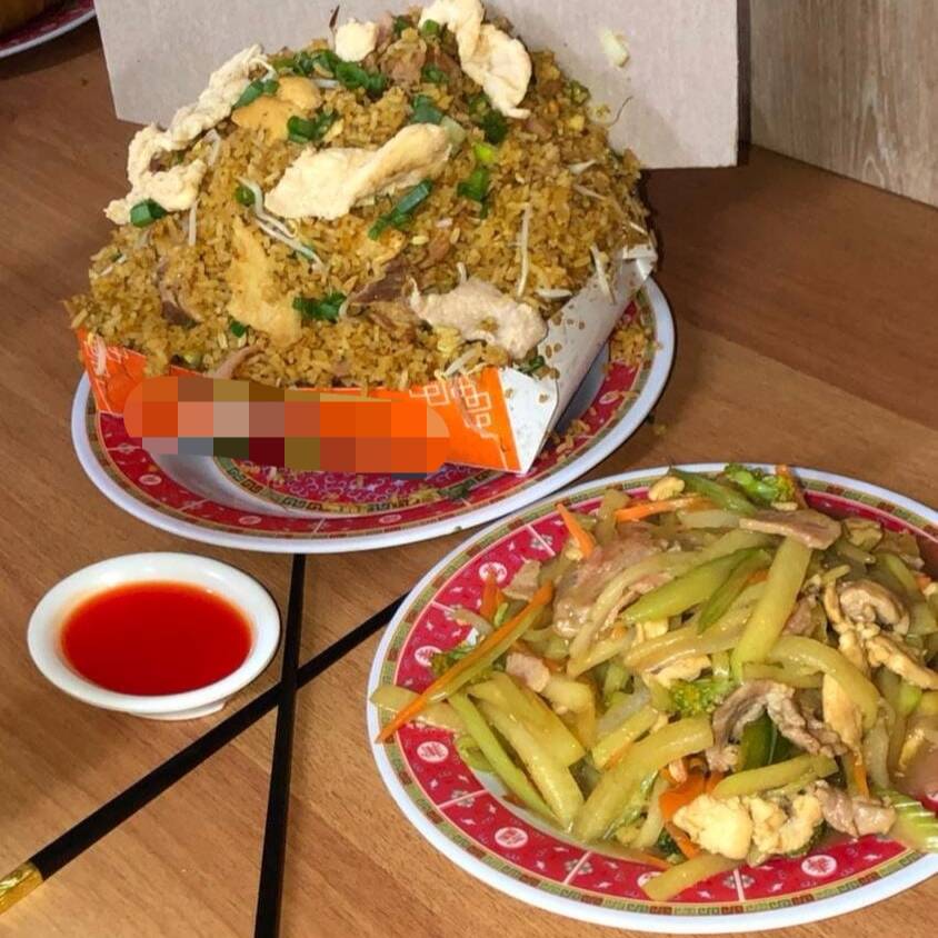 Arroz chino especial mediano, con trozos de pollo, cerdo, jamón, raíces y cebolla acompañado de salsa agridulce, ideal para 3 o 4 personas, va empacado en una caja.
