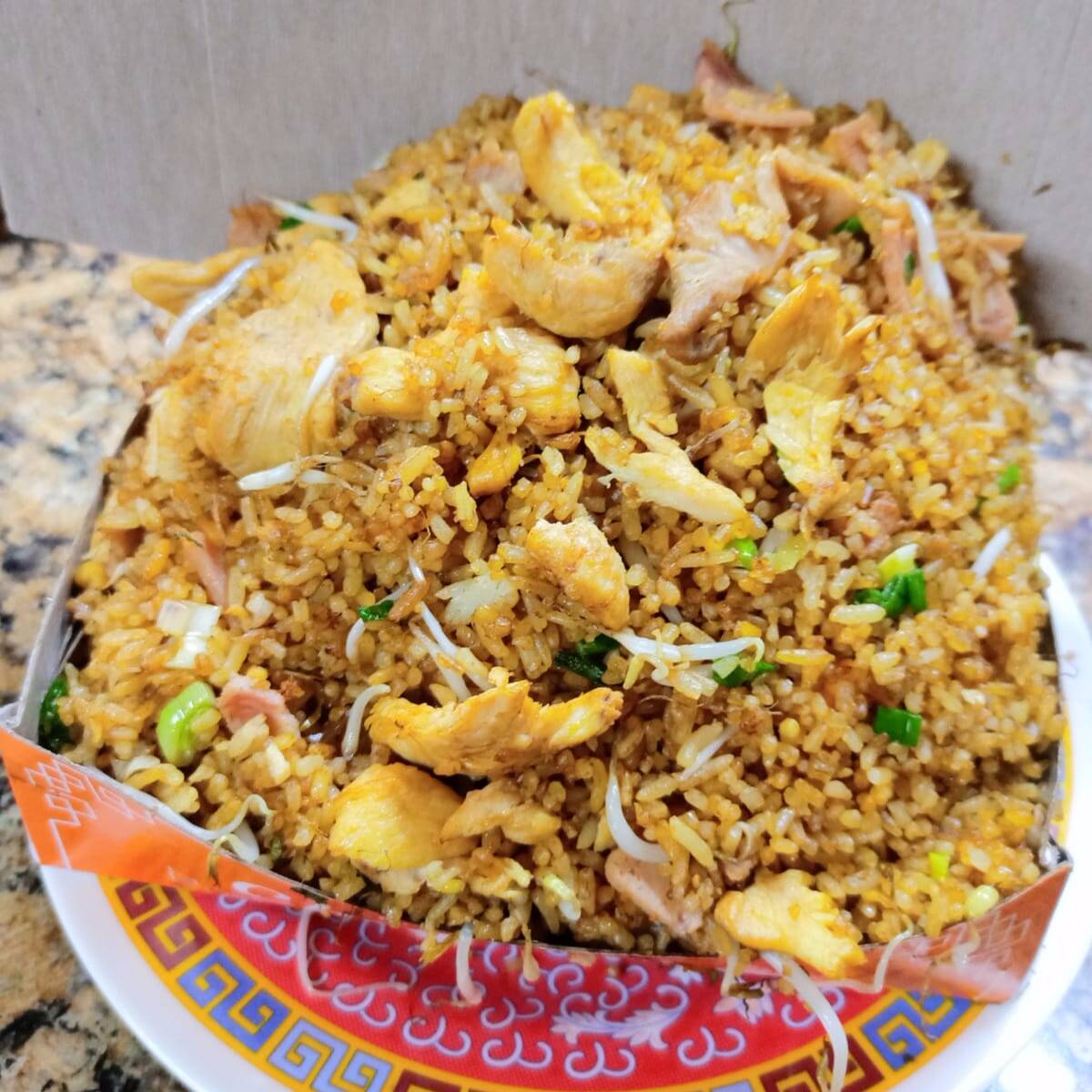 Caja grande de arroz con pollo, raices chinas y vegelates salteados, perfecto para 7 o mas personas